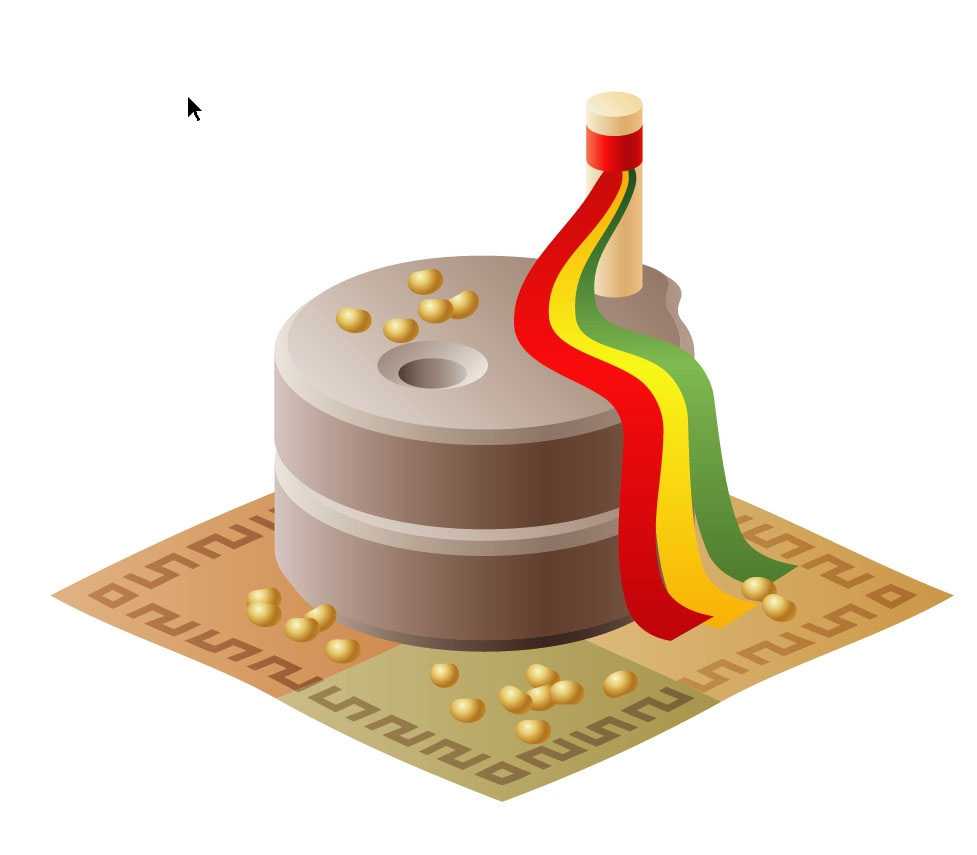 1、先用钢笔与圆形工具画出大的磨盘轮廓,再把下面的毯子与上面的花纹也一一绘制出来,最后,还有转棒与装饰飘带的细节元素的路径。