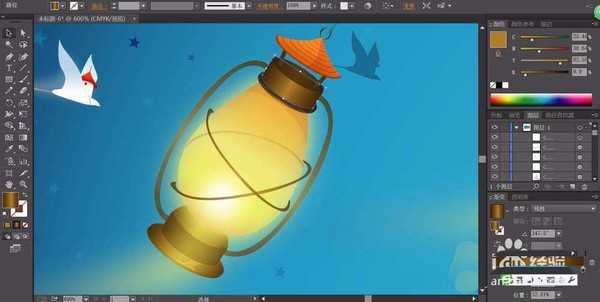 5、我们用古铜色的渐变填充灯的上下结构件,用橙黄色的渐变填充灯的中间部位的路径,在灯的中间与下方的位置的铜材质的结构件设置一下透明度到66%左右,从而呈现一种光照的半透明的效果。再画出整个灯的长长的轨迹线,我们用半透明的黄蓝色的渐变填充。