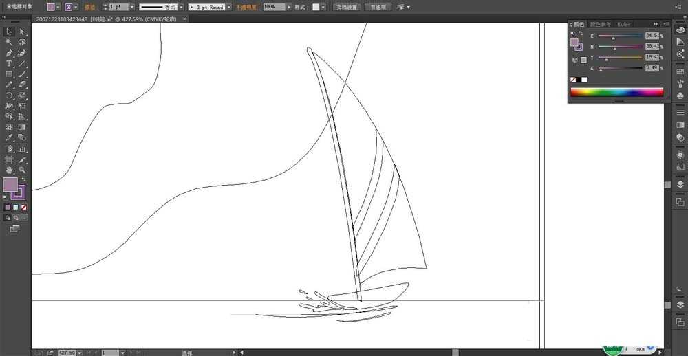 5、使用钢笔在船的下方画出海浪的基本轮廓,我们用半透明的天蓝色填充海浪的基本轮廓。