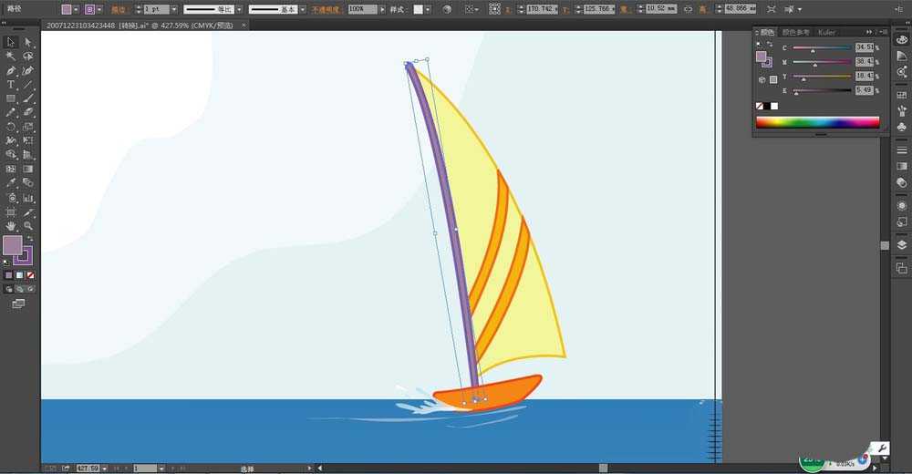 4、继续使用钢笔画出大海上面的一只小小的帆船的基本轮廓,我们用不同明度的黄色填充船帆的主体与骨架,用橙色填充船。