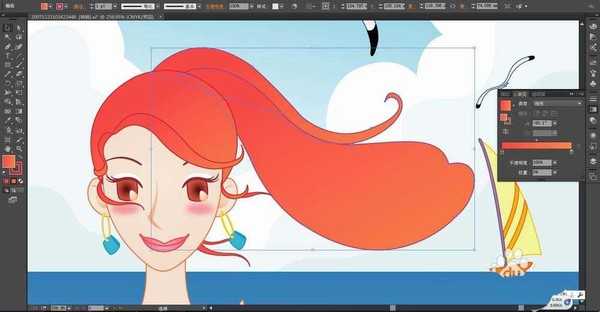 7、用火红色的渐变填充女子的长发的路径,再用粉色的渐变填充女子的脸蛋的路径。
