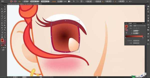 8、这一步重点来绘制女子的眼晴的路径与填色,我们用红褐色的渐变填充女子的眼晴,再用半透明的粉色填充眼晴的高光区域。使用圆形工具画出女子的脸晕,我们用粉红色的渐变填充,再做出一个模糊的滤镜。女子的嘴巴用品红色的渐变填充,再用红色进行描边。女子的耳环用蓝色与黄色搭配填充。