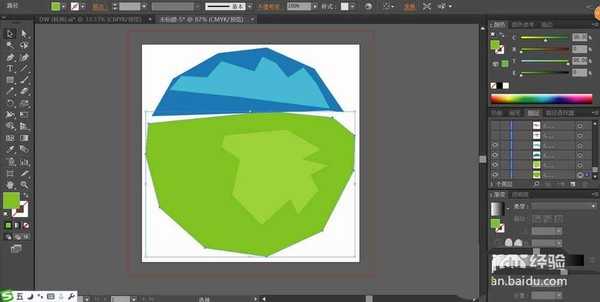 1、用钢笔画出背景成的圆形元素的路径,我们填充上半圆形为蓝色,下半圆形为绿色,分别画出上下两个高光区域,我们用淡蓝色与淡绿色填充高光区域。