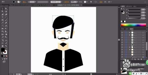 3、继续画出艺术家的眉毛、胡子并用黑色填充,用钢笔画出艺术家的眼晴与嘴巴,我们用橙黄色填充。