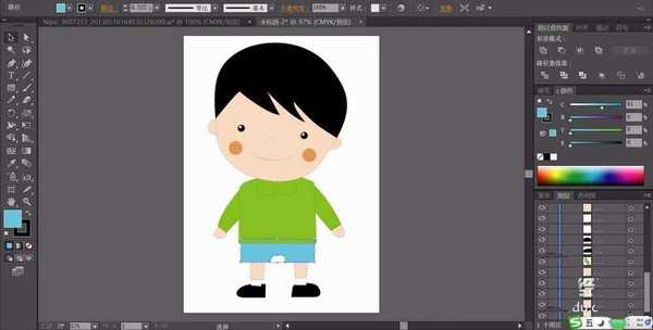 6、使用网格工具让衣服呈现绿白渐变,头发呈现黑白渐变,裤子呈现蓝白渐变,脸蛋呈现粉白渐变,小哥哥简笔画设计完成。