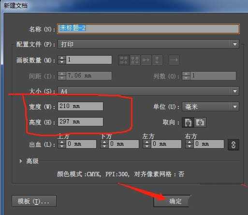 1、打开Adobe Illustrator CC 2015 软件,点击文件—新建弹出对话框,调整宽高度,点击确认建立画布。