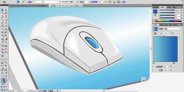 5、用灰白色的渐变填充鼠标,用蓝色的渐变填充滚轮,用灰黑色填充各个结构件之间的连接线。用白色填充高光,用灰黑色填充暗光。
