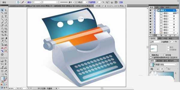 7、我们用橙红色的渐变填充打字机的滚轴,用半透明的橙色渐变填充高光区域。用灰白色的渐变填充打字机的键盘按钮,还有各个侧面的路径,完成打字机简笔画。