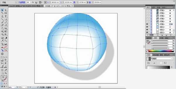2、我们复制一下这个图形并填充白色,继续复制这个图形并填充灰白色,我们把白色与灰白色的图形分别向右下移动。我们用网格渐变的方式在图形的中间画出蓝白色的渐变作为高光区域。