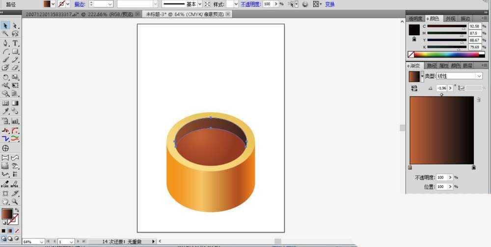 3、复制这个圆形的路径缩小到80%左右,与原来的圆形中心对齐,我们用暗橙色的渐变填充。