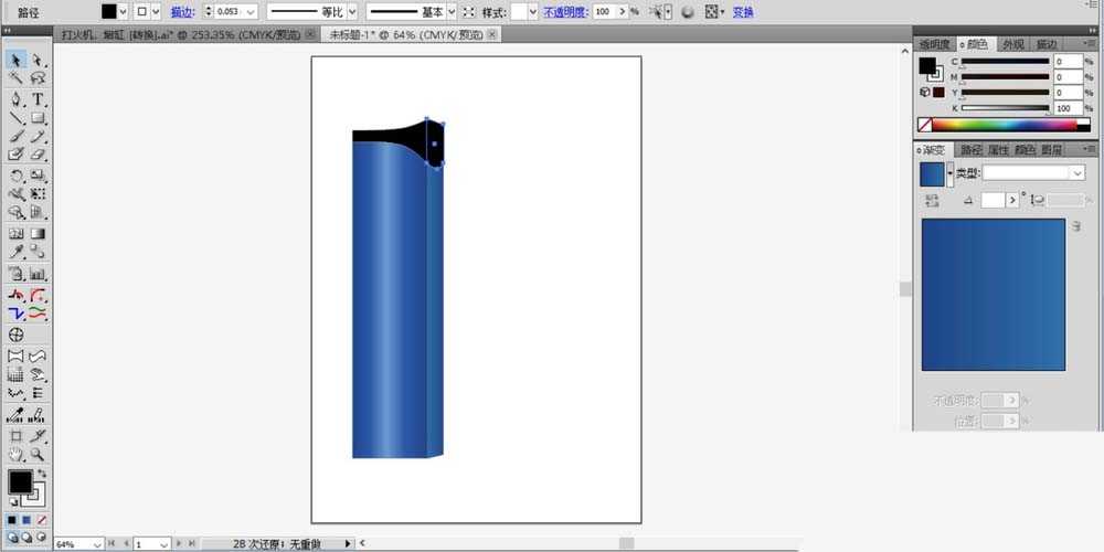 3、我们用蓝色的渐变填充打火机的正面路径,让高光区在中间。