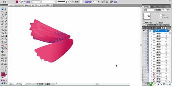 1、首先,我们用钢笔画出一片花瓣的形状,注意边缘的曲线部分,我们用深粉红色的渐变填充路径。