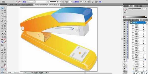5、我们继续画出订书机上侧的手柄并用橙色的渐变填充,画出订书机底座上面的贴片并用灰白色填充,在贴片上面的有着细节元素,我们一一绘制出来,凸起的结构用灰黑色填充,而圆形的结构用橙黄色填充。