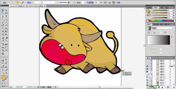 5、在嘴巴里面,我们为金牛绘制出一颗小小的爱心路径并填充为火红色,继续绘制出牛角的形状并用棕褐色进行填充。设置光线为从右向左,左侧画出暗区路径并用暗色调的土黄色填充,右侧画出亮区路径并用亮色调的土黄色填充。