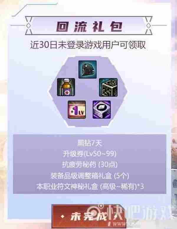 回归玩家可额外领取一份回流礼包。礼包内含疲劳药、升级券、装备品级调整箱、本职业符文神秘礼盒以及黑钻等奖励。
