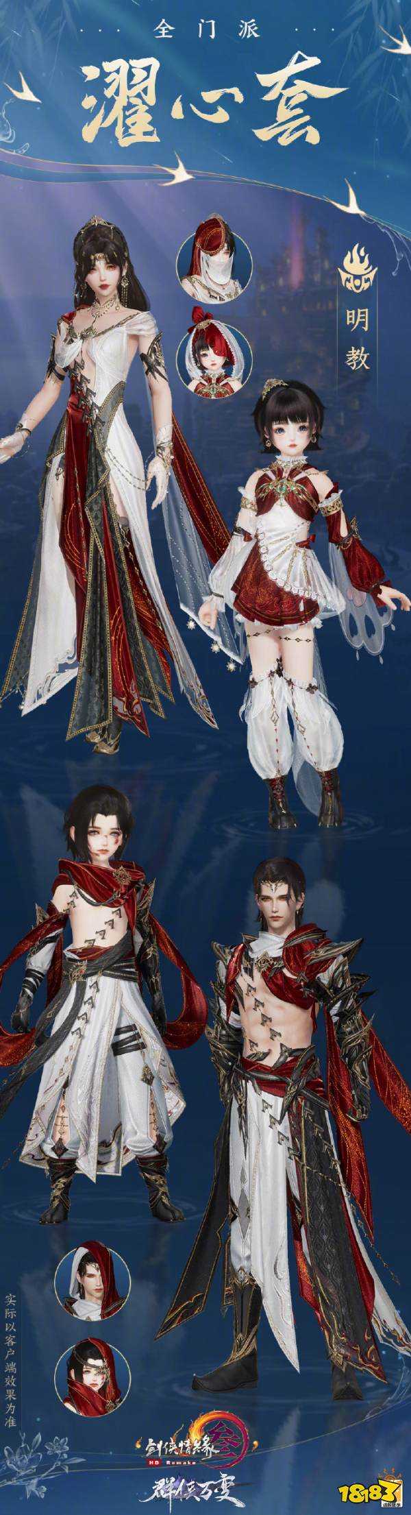 明教“濯心”套黑白两色纱缎披茫茫月色,赤红长锦自兜帽环绕而下,优雅款款。衣裳边缘金线明灿,仿佛醇酒浓郁醉人,又携翎刃藏锋,宛如灵猫机警敏锐。水火明力微妙风,暗沉弥散三界中,浩瀚大漠望断,潜行荒原莽莽。