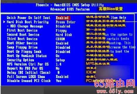 4、第二项为AdvancedBIOSFeatures(高级BIOS设置),设置开机的第一启动项,是平时装系统的时候需要用到的。