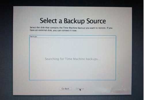 6、如果点击 Restore From Time Machine Backup,记着此时要将过去用作 Time Machine 备份的外置硬盘与 MacBook Air连接后 ,再点按「Continue」。