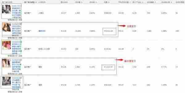 红框中一款为主推,花费最大,另外一款红框中的为副主推宝贝,而绿框中的则是作为副推宝贝进行推广的。