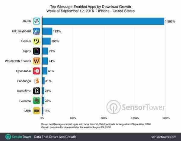 iMessage Apps等新的机会,据国外媒体分析,首批支持iMessage的App的下载量飙升,最夸张的是JibJab,在iOS10发布的第一周下载量较之前飙升1500%以上。