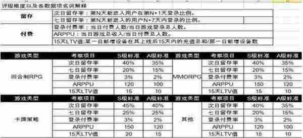 可以看到,同步推比较看中的是次日留存和用户的ARPU。而在七日留存的要求上,相比PP助手,明显要更宽松一些。拿回合制RPG来说,在PP助手能做到A级,在同步推就是S级的标准了,但是这样简单的横向比较明显是不科学的。