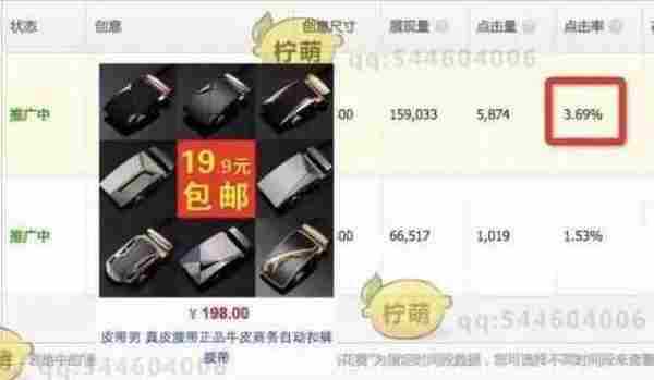 这是我今年的一个客户,皮带的行业点击率其实不高,上面的客户从0.4的点击率,优化到3%。上面这张图,最开始是9.9包邮,后来提价的,所以截图的时