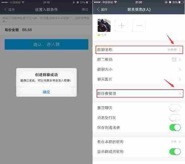 第六步:创建群成功之后,可以修改进群经费金额,群名称,但所修改的呢称不能出现:支付宝、刷信誉、银行卡等违禁词。